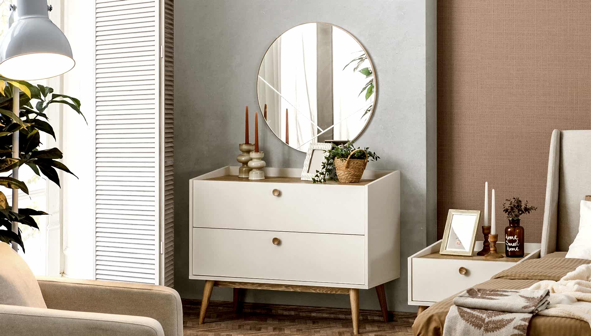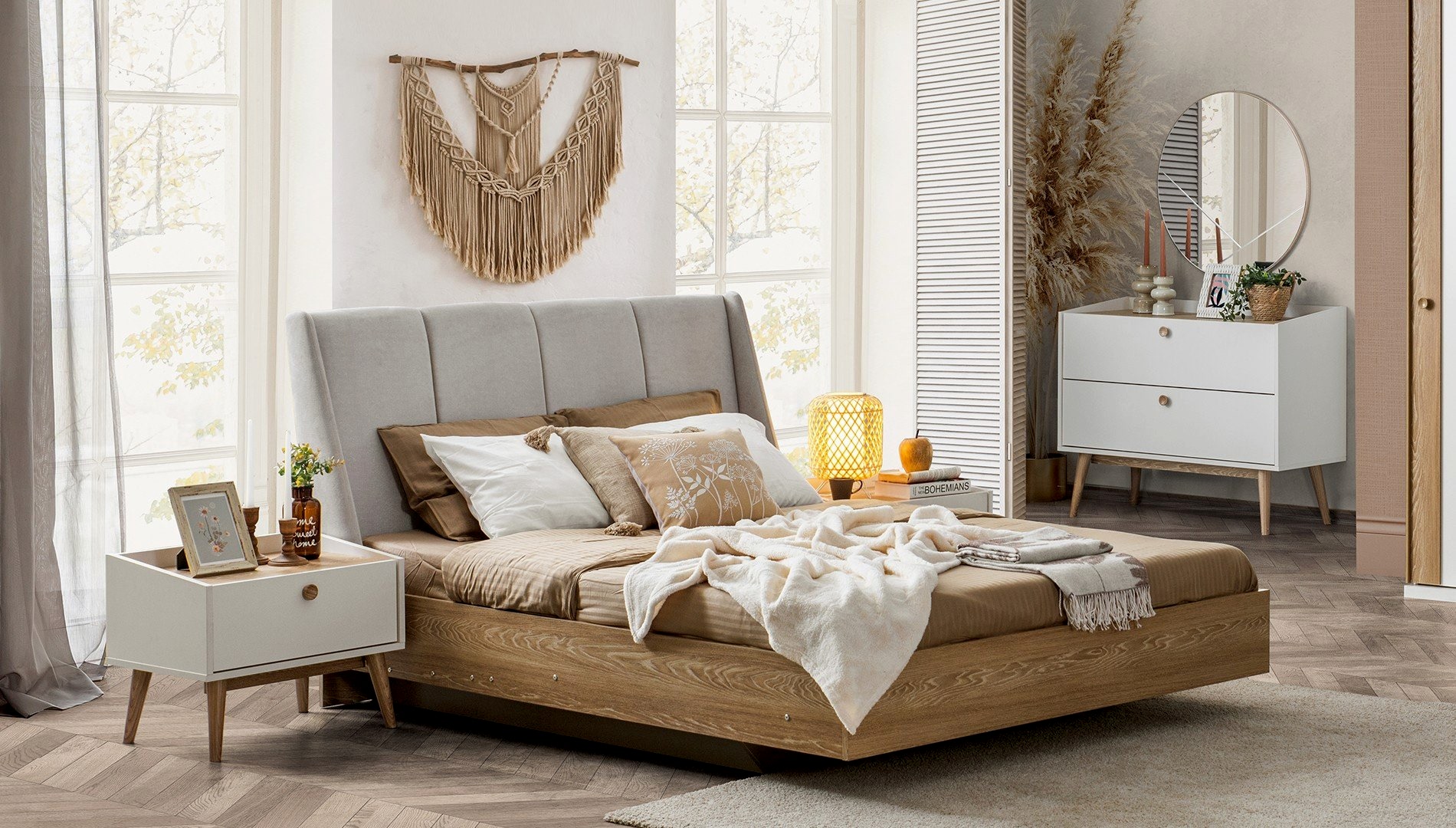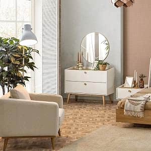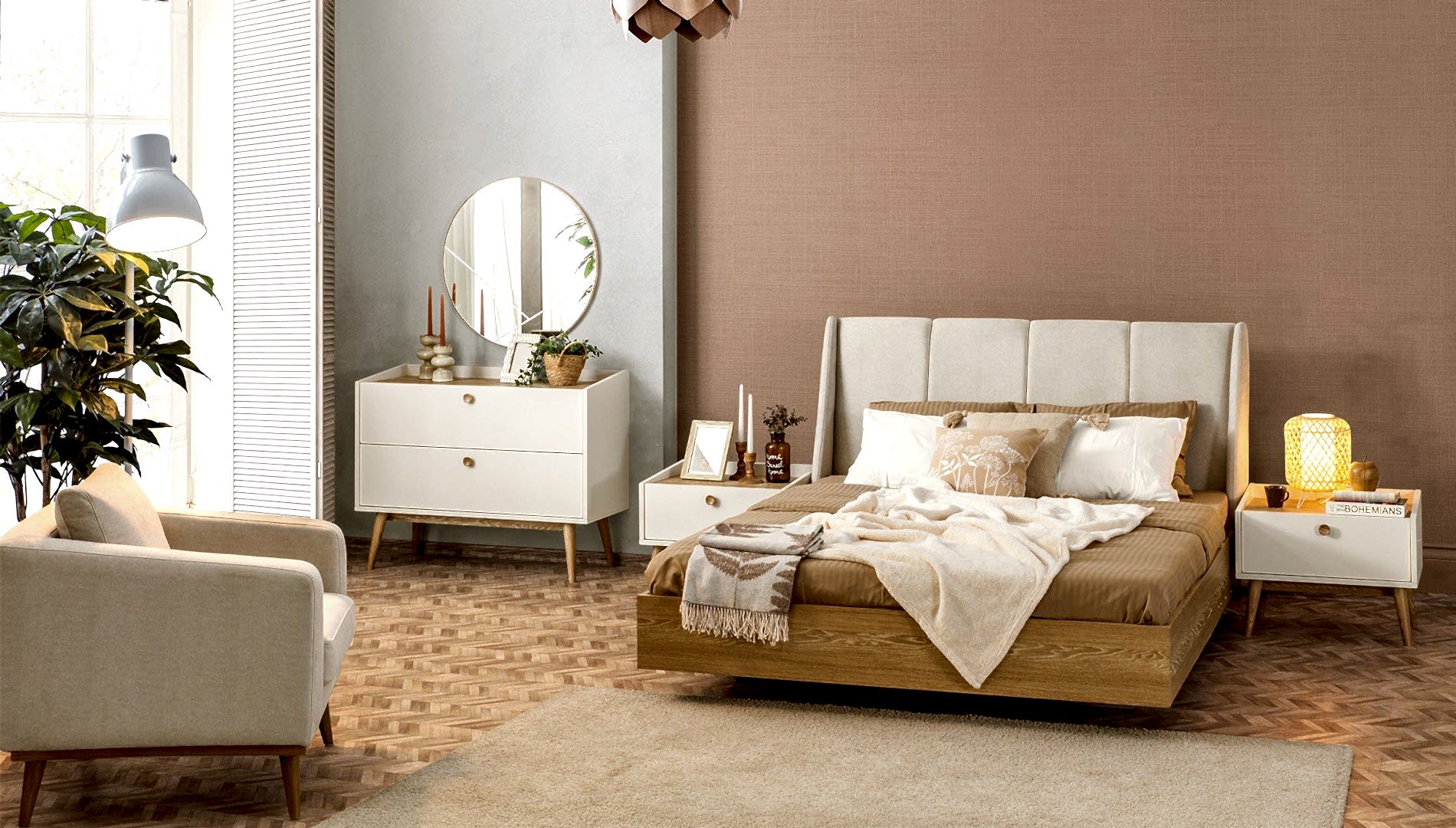 YATAK ODASI TAKIMI: Karyola, karyola başucu, 2 adet komodin, gardorop, şifonyer, şifonyer aynasından oluşmaktadır.