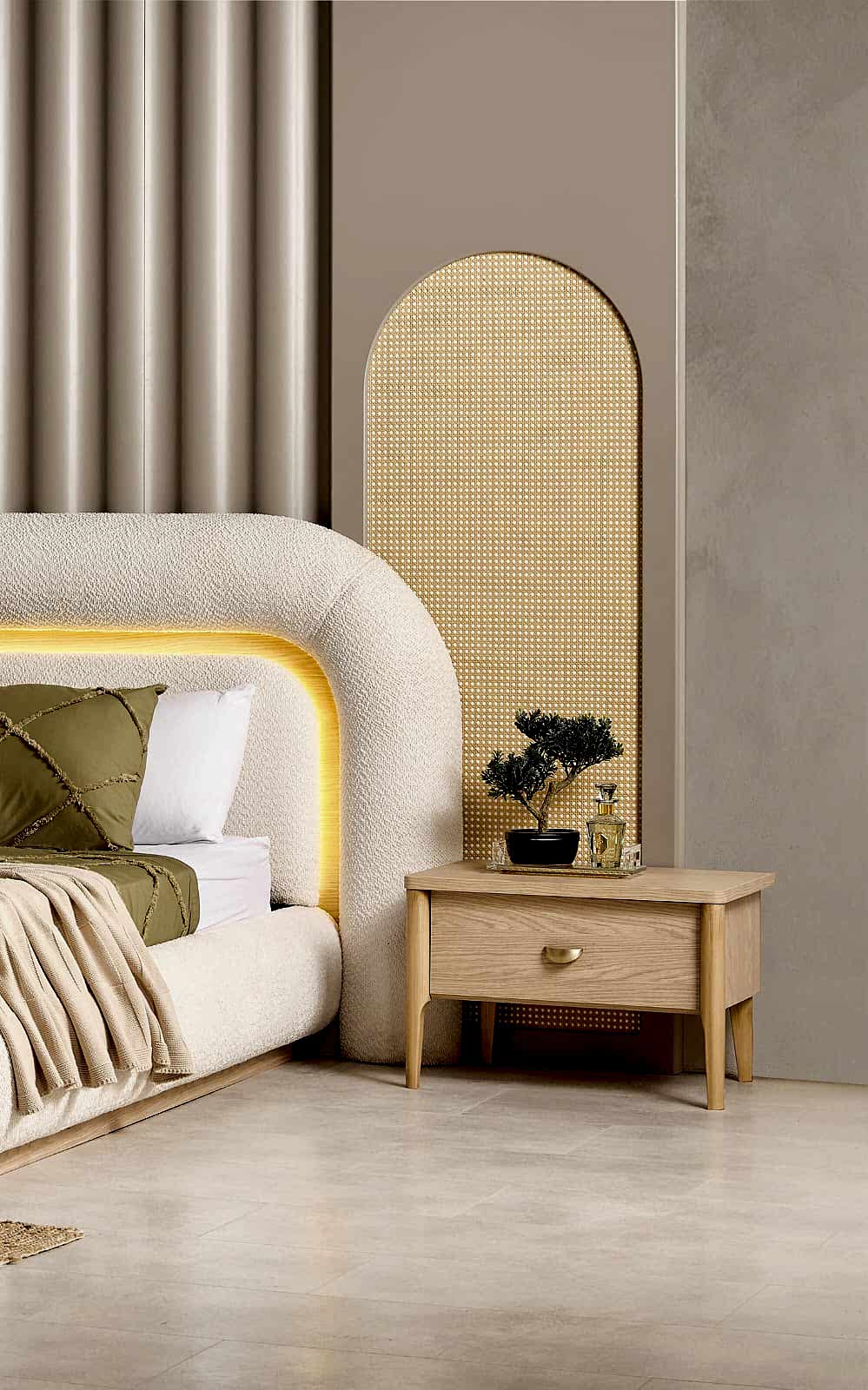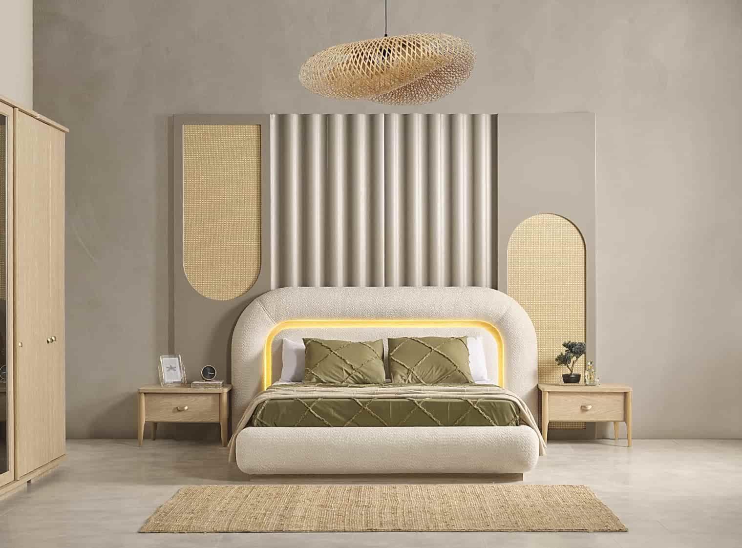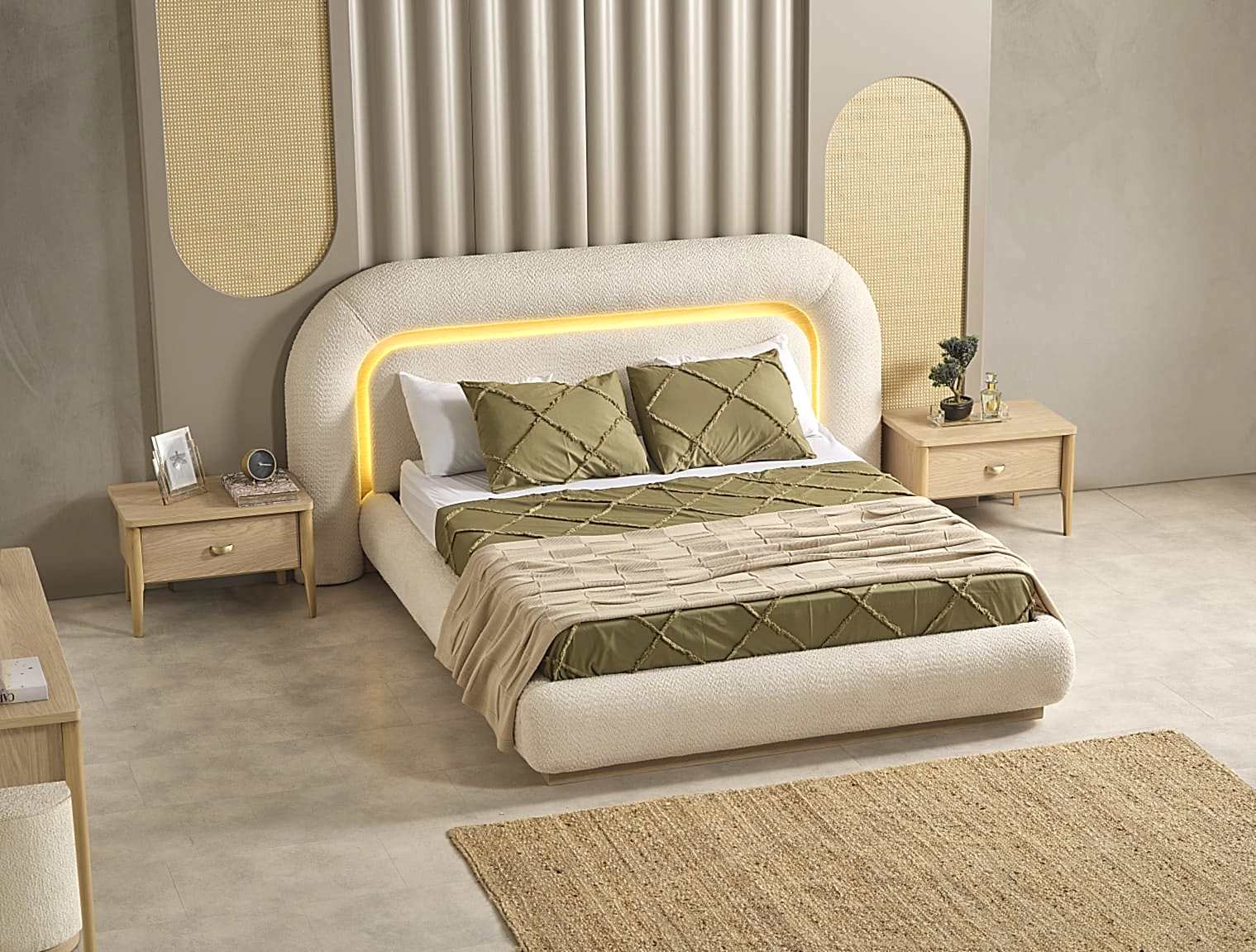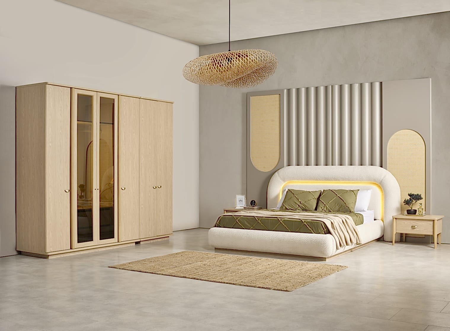 YATAK ODASI TAKIMI: Karyola, karyola başucu, 2 adet komodin, gardorop, şifonyer, şifonyer aynasından oluşmaktadır.