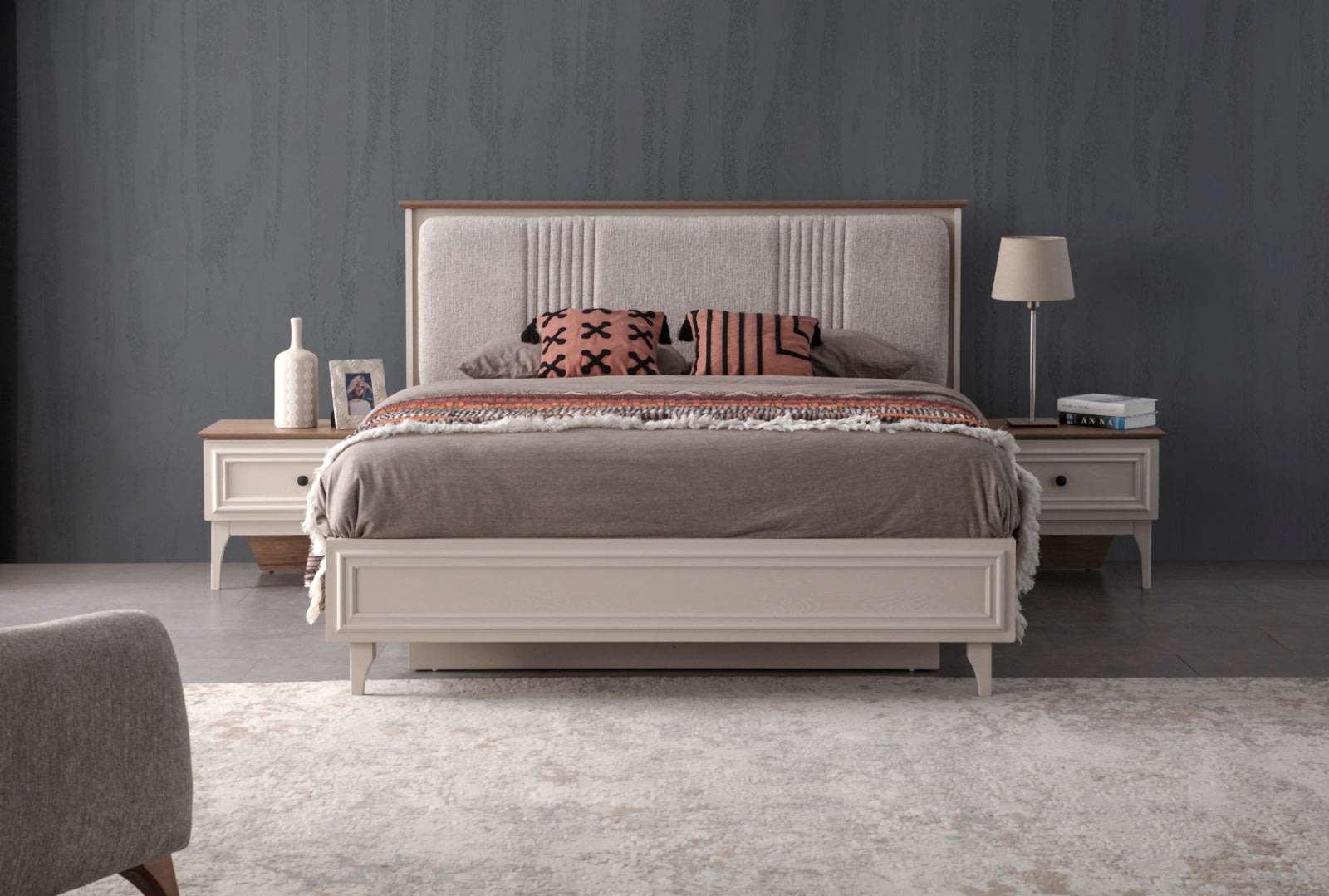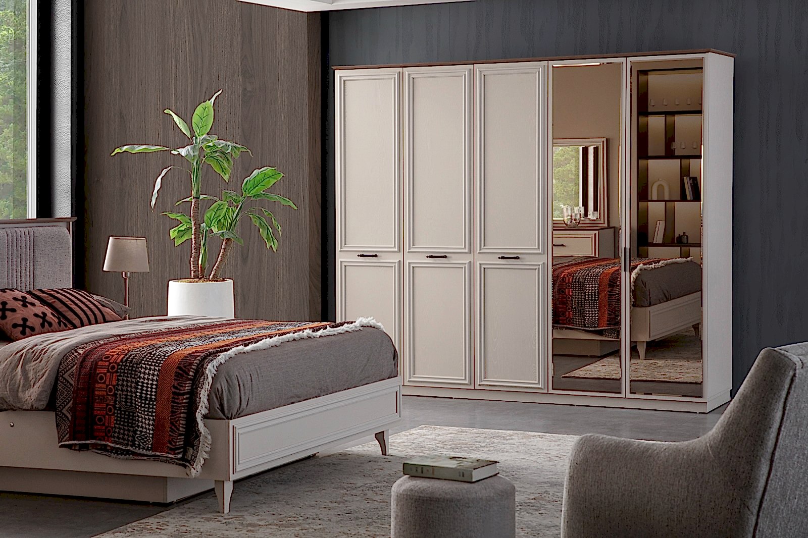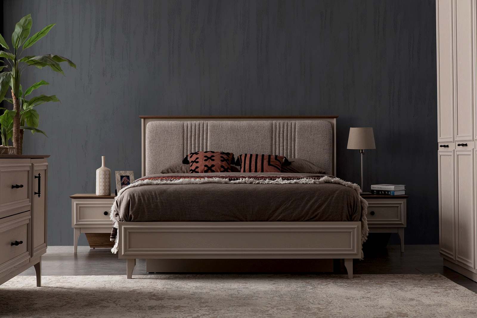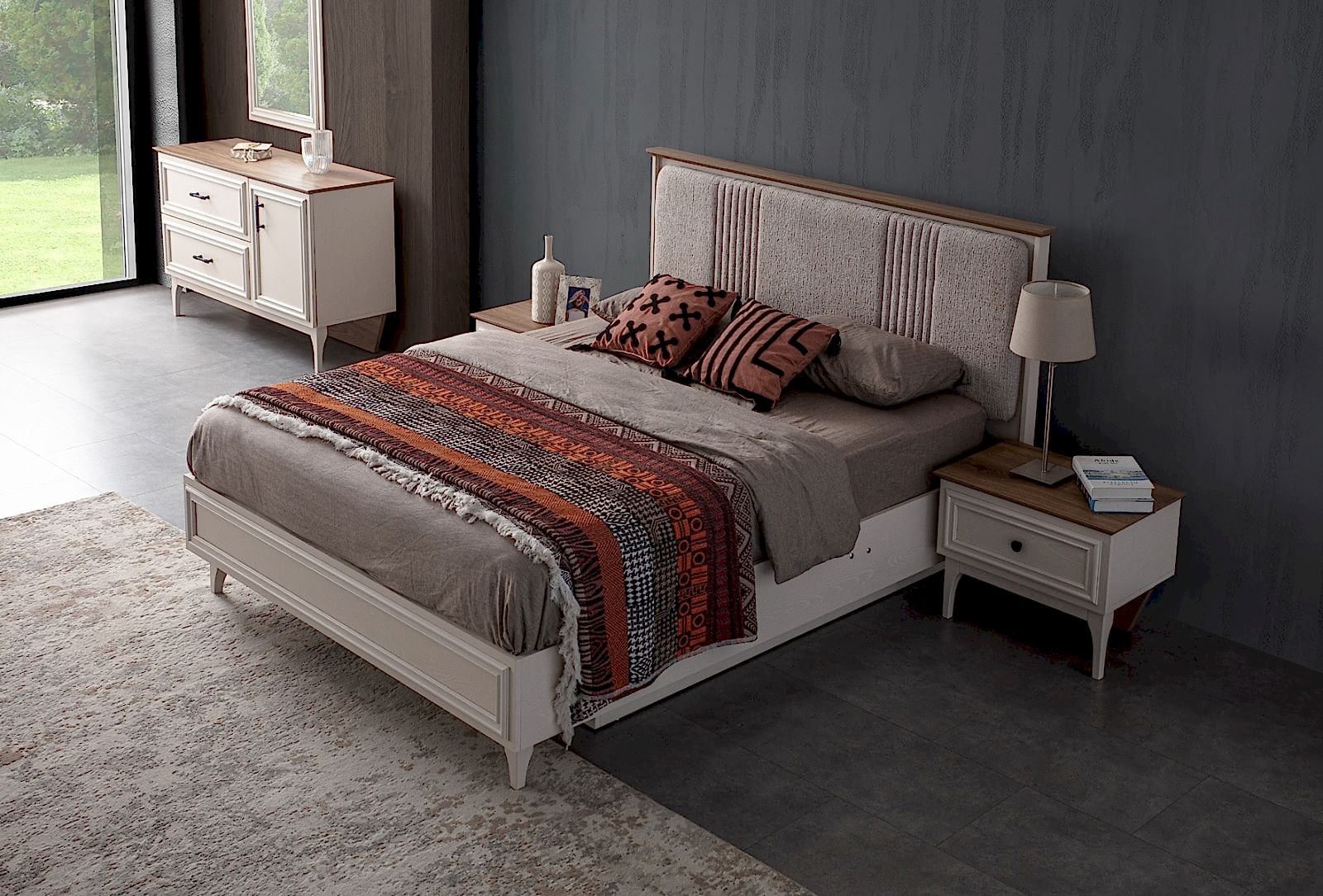 YATAK ODASI TAKIMI: Karyola, karyola başucu, 2 adet komodin, gardorop, şifonyer, şifonyer aynasından oluşmaktadır.