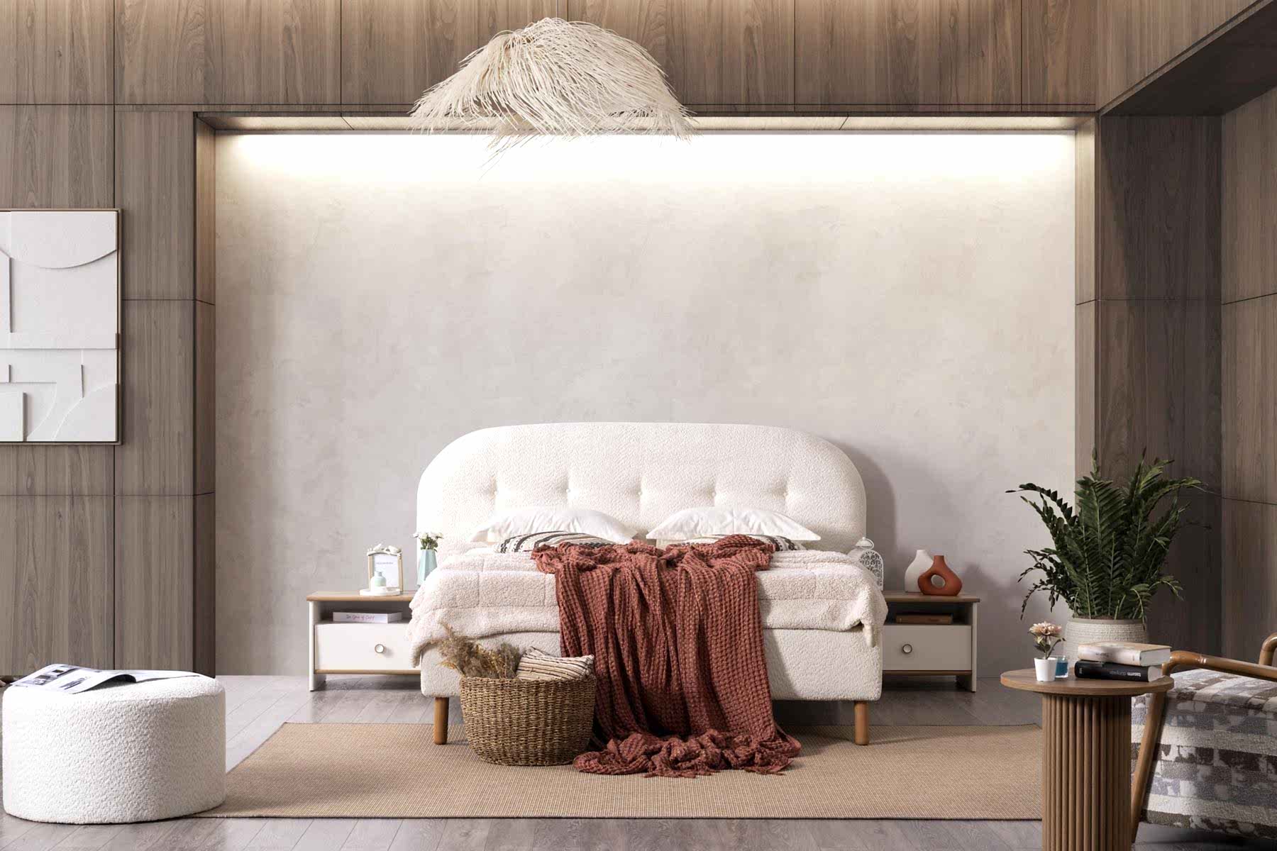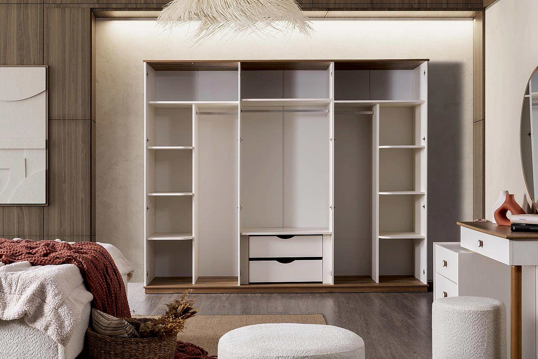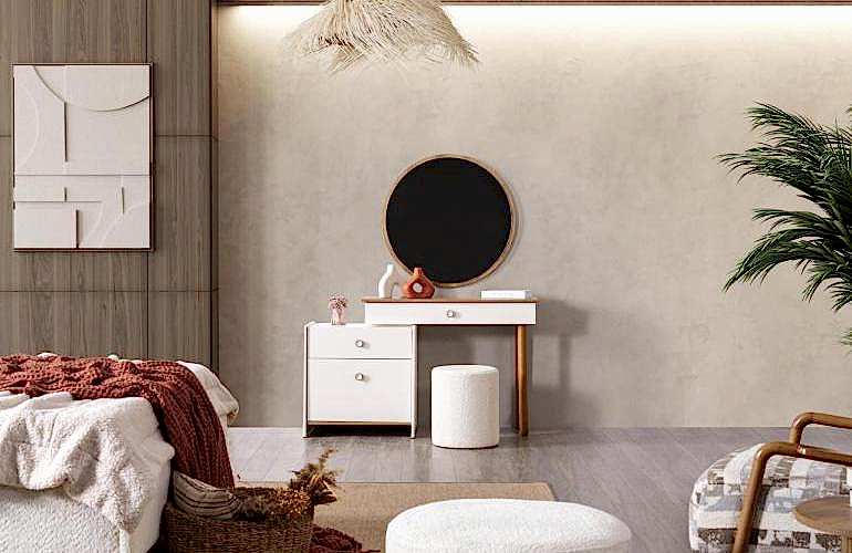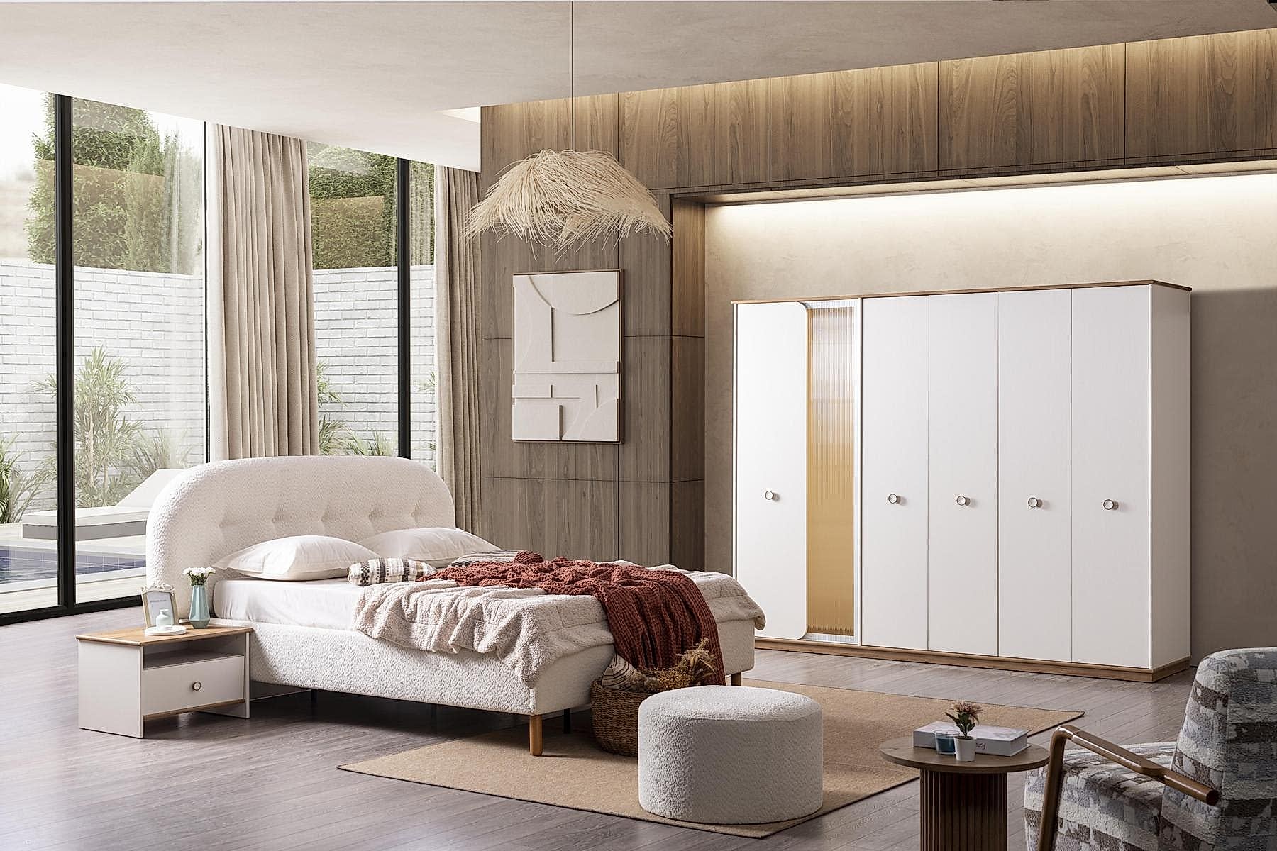 YATAK ODASI TAKIMI: Karyola, karyola başucu, 2 adet komodin, gardorop, şifonyer, şifonyer aynasından oluşmaktadır.